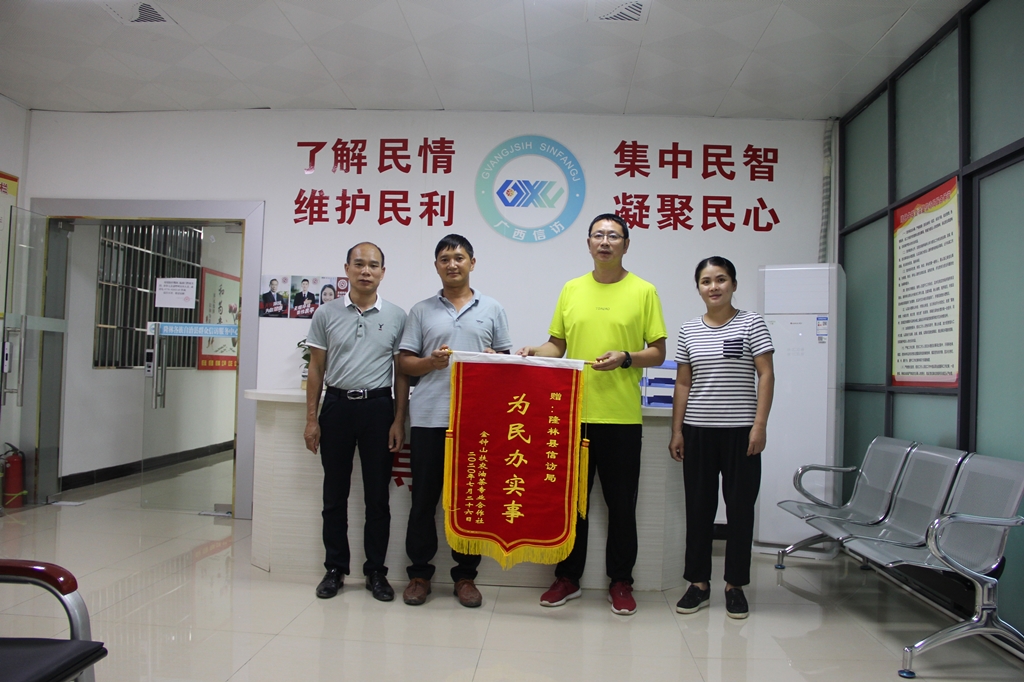 8月25日下午,隆林各族自治县群众信访服务中心大厅出现温馨的一幕,金钟山扶农油茶专业合作社信访群众代表将一面印有“为民办实事”的锦旗送到自治县信访局工作人员手中,表达他们对该局耐心细致地工作,妥善解决其信访难题的感激之情。